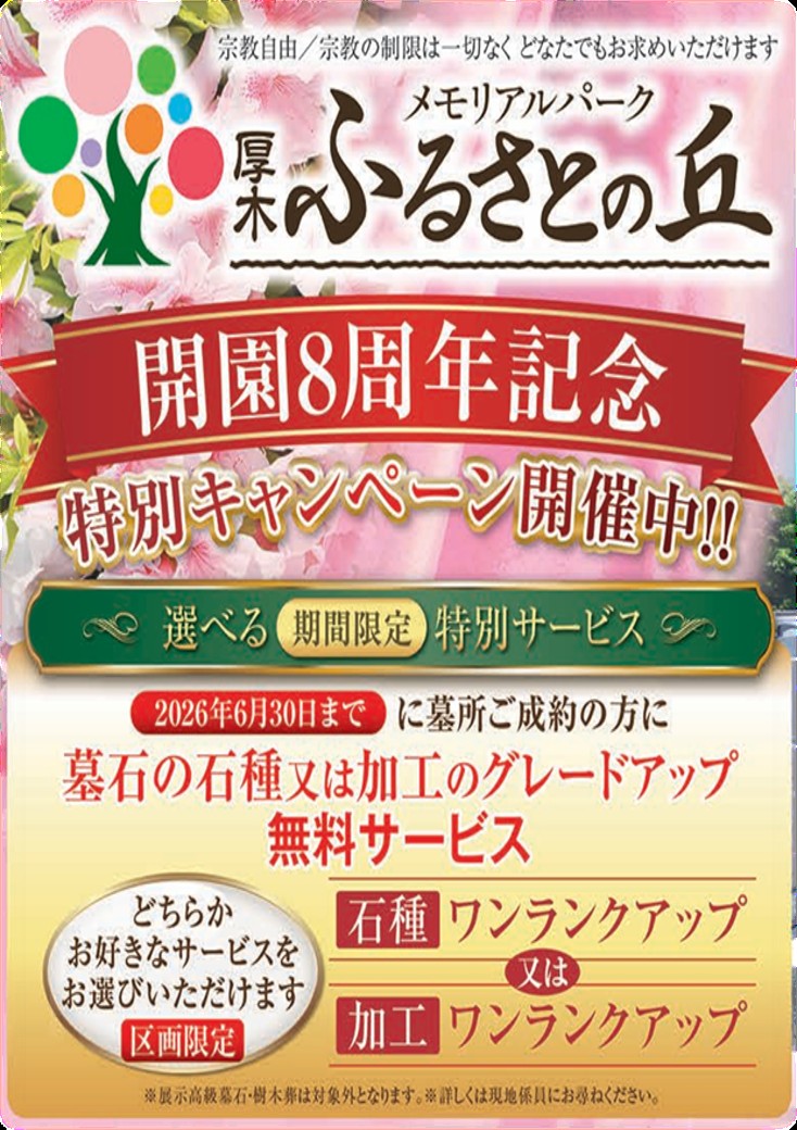 開園8周年 厚木ふるさとの丘は、開園8周年記念といたしまして 「ワンランクアップキャンペーン」 を開催中です。 6月30日までとなっておりますのでお早目の ご見学をお待ちしております。 ご見学・お問い合わせは、 霊園施設協会株式会社 フリーダイヤル 0800-800-1636 « お墓選び